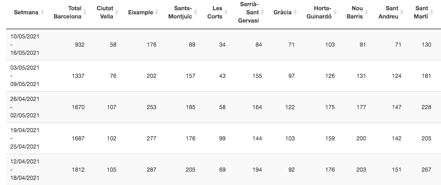 Per primera vegada en molts mesos, fins a set districtes de Barcelona estan per sota dels 100 casos setmanals, una fita que tampoc s’assolia des de l’estiu passat, just abans de l’inici de la segona onada –tot i que llavors no hi havia vacunes ni tampoc perspectiva de tenir-les–. Només l’Eixample (176), Horta-Guinardó (103) i Sant Martí (130) registren més d’un centenar de positius a la setmana, però la seva tendència és clarament a la baixa com a la resta de la ciutat.
