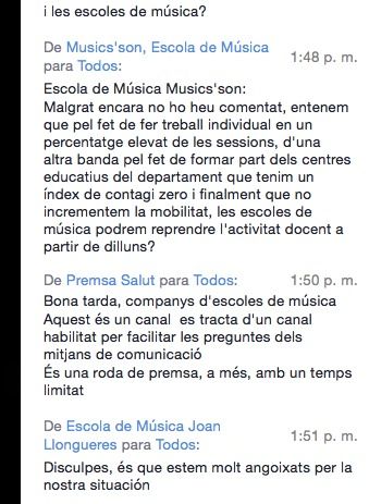 La Sara, enlloc de marxar s’ha quedat i ha decidit plantejar a l’espai de xat algunes preguntes, reclamant respostes per les escoles de música privades, que des del 29 d’octubre estan tancades. La moderadora del xat ha intervingut per informar-li que es tractava d’una roda de premsa i que només podien preguntar periodistes, tot i que podia romandre escoltant.