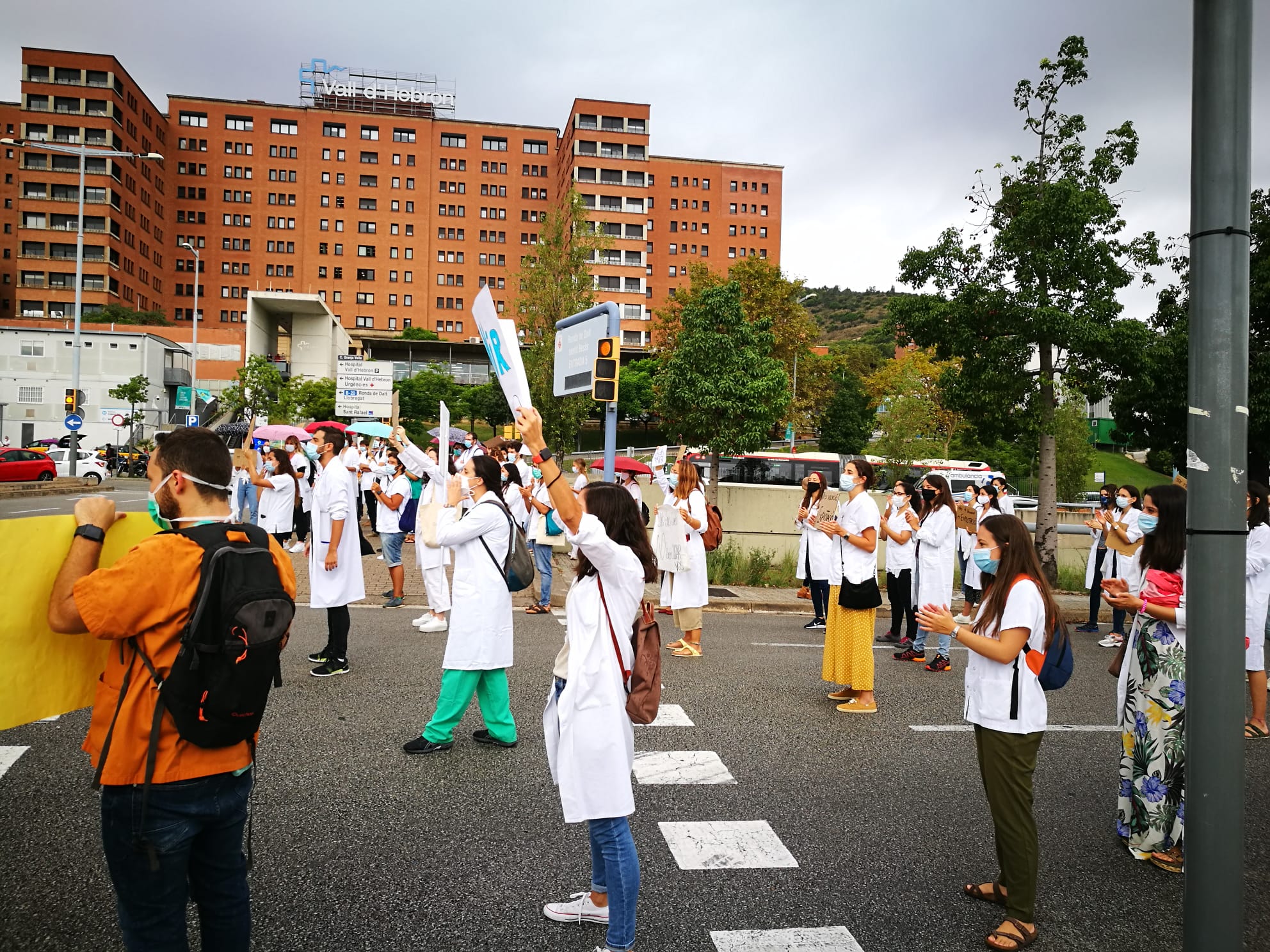 Un dels exemples és l’entorn de l’Hospital de la Vall d’Hebron, on el col·lectiu de metges interns residents –juntament amb companys que els donen suport– han tallat la circulació en sentit Besòs de la ronda de Dalt durant un quart d’hora. Eren prop de 200 professionals denunciant “l’explotació” que pateixen.
