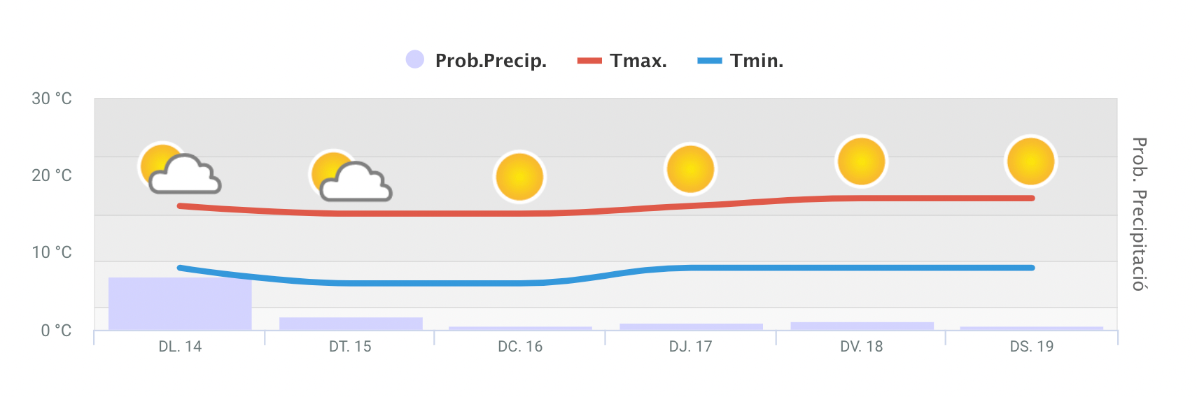 Ja de cara a la setmana vinent, es recuperen una mica les temperatures, si bé dilluns la probabilitat de pluja es trobarà en el punt més alt de tota la setmana. Arrencarem la setmana laboral amb una temperatura mínima de 9 graus i una màxima de 16, amb sol i núvols. A partir de dimecres desapareixen els núvols i torna el sol, amb temperatures que a finals de setmana s’enfilaran a màxims de 17 graus i les mínimes es mantindran en els 9 graus.