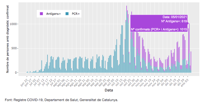 Rècord de contagis en un sol dia a Barcelona en aquesta tercera onada de Covid-19. El dia 5 de gener es van registrar 1.015 positius, una xifra que no es donava des del 3 de novembre, en ple descens de la segona onada. A més, el dia 4 també va ser especialment complicat amb 910 casos, la segona xifra més elevada dels últims dos mesos, segons les dades de l’Agència de Salut Pública de Barcelona (ASPB).
