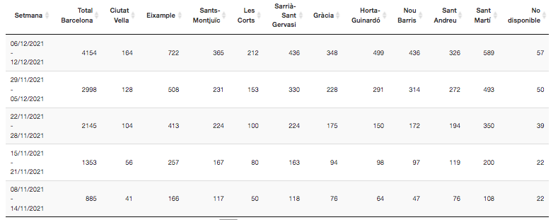 L’Eixample, amb 722 casos, és el districte amb més positius de la ciutat, seguit de Sant Martí (589), Horta-Guinardó (499), Sarrià-Sant Gervasi (436) i Nou Barris (436), gairebé el 70% de tots els casos de Barcelona. A l’extrem oposat hi ha Ciutat Vella (164), les Corts (212), Sant Andreu (326), Gràcia (348) i Sants-Montjuïc (365).