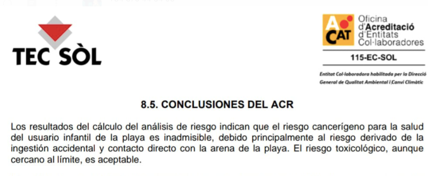 L’estudi, de 107 pàgines i elaborat per l’empresa Tecsòl, avalua quines serien les possibles conseqüències per a la salut en nens que acudeixin uns 60 dies a l’any a la platja. Conclou que el perill per presència de compostos potencialment cancerígens depassa els paràmetres de referència, “atès principalment al risc derivat d’ingesta accidental i contacte directe amb la sorra” per part de menors. La investigació precisa que, en el cas de població infantil, “el risc cancerigen és acceptable si no se superen els 7,5 dies d’exposició” a la platja, alhora que indica que el risc toxicològic d’altres substàncies identificades que no indueixen a desenvolupar càncer sí s’adequa a l’índex aconsellable, tot i que s’aproxima al llindar.