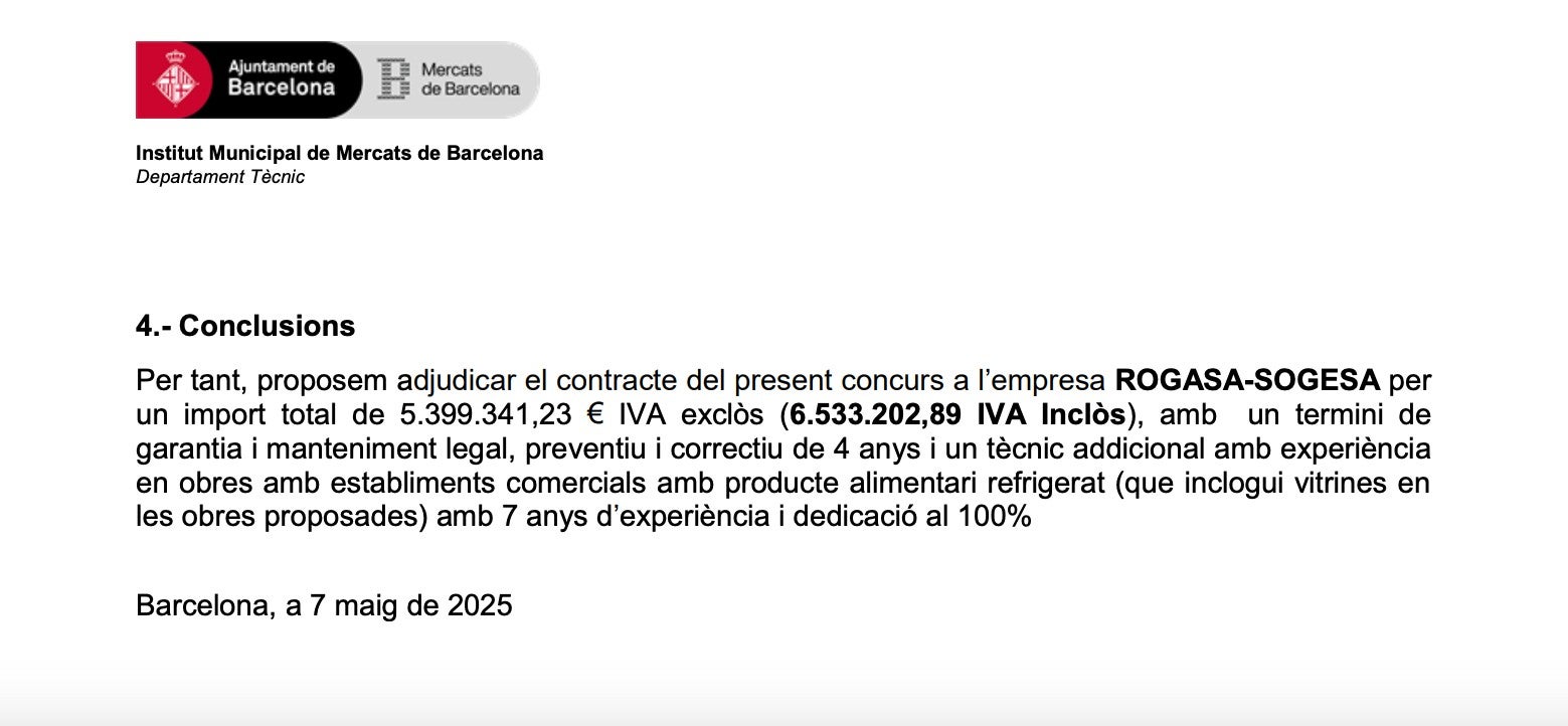 Aquesta setmana, l’Ajuntament ha anunciat l’adjudicació de l’obra a la Unió Temporal d’Empreses (UTE) Rogasa-Sogesa, del Prat de Llobregat, per un import de 6.533.202,89 euros, IVA inclòs, indica un document signat el 7 de maig passat consultat per aquest mitjà. No obstant això, la resolució de la presidenta de l’Institut Municipal de Mercats, la tinenta d’alcaldia Raquel Gil, sobre les obres de construcció i manteniment de la carpa s’apropa als 7,3 milions d’euros fins al 2027, detalla la informació facilitada aquesta primavera passada al consell rector de l’Institut Municipal de Mercats i a la qual ha tingut accés el TOT. Amb els anys, el pressupost s’ha anat encarint, passant dels 3,2 milions inicials a, posteriorment, 5,8. I, posteriorment a les xifres esmentades, amb anterioritat