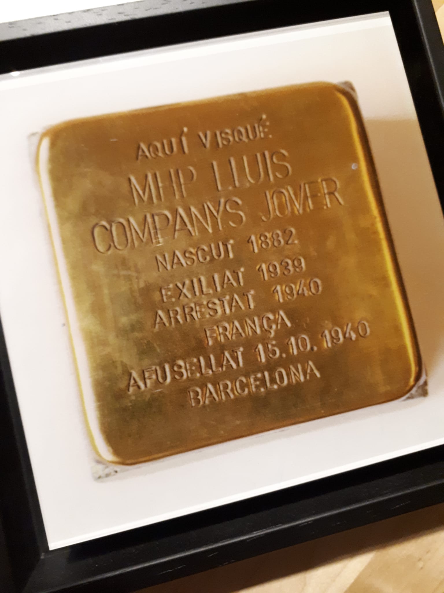 “Aquí visqué MHP Lluís Companys Jover, nascut 1882, exiliat 1939, arrestat 1940 França, afusellat 15.10.1940 Barcelona”. És la inscripció que es llegeix en una llamborda dedicada al president Companys, detingut per la Gestapo nazi i afusellat pel règim franquista al castell de Montjuïc. Es tracta d’un record de forma quadrada i fet de llautó –un format de memorial al paviment molt comú al centre d’Europa– que posa en valor la figura del president de la Generalitat assassinat pel feixisme i avisa dels perills del totalitarisme.