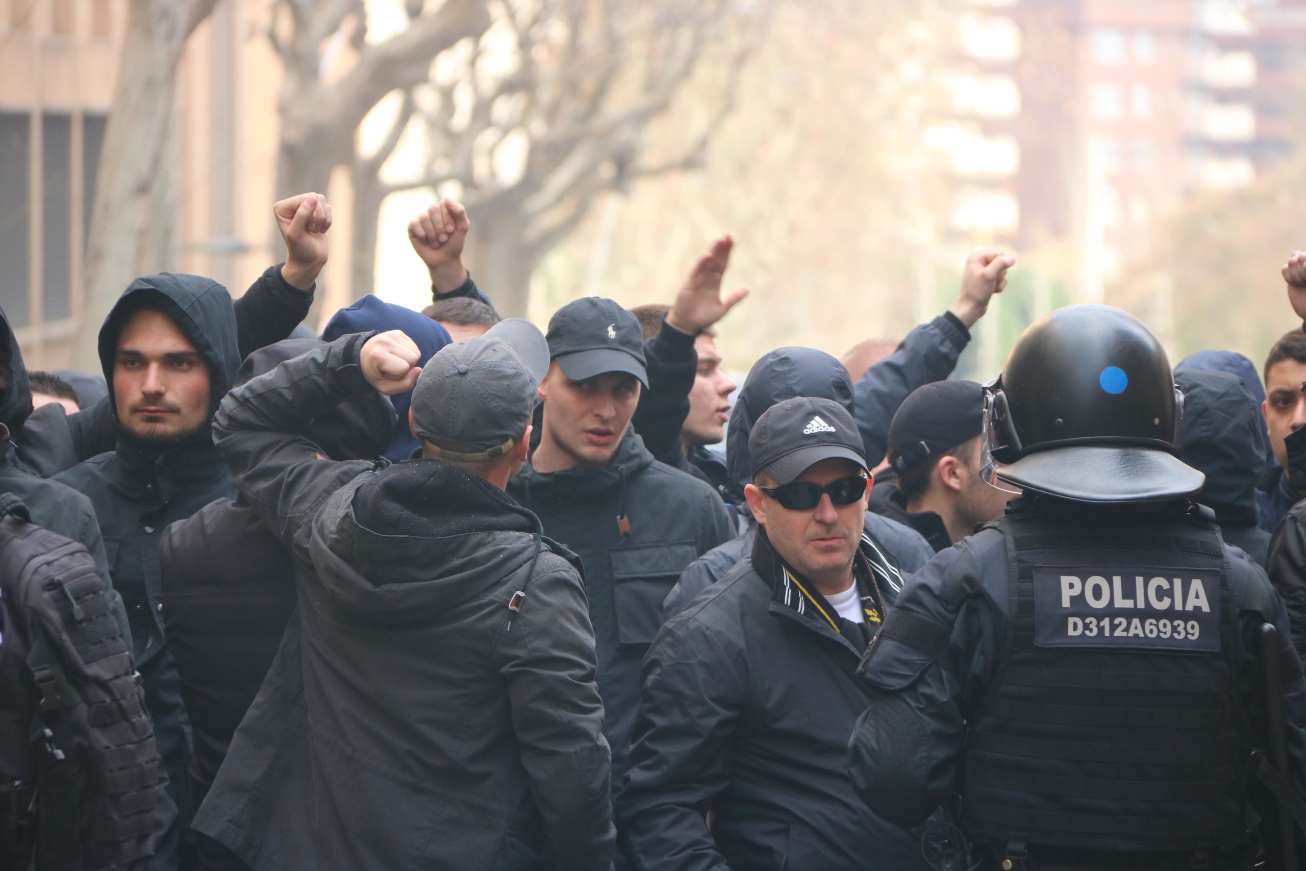 Durant el trajecte, han llançat bengales i s’ha produït una fumera espessa al carrer Sant Joan Bosco. Mentrestant, cridaven “Ultrasur, ultrasur”, el nom dels aficionats ultres del Reial Madrid, als quals sembla que donen suport almenys avui, que el seu equip juga contra el Barça i es juga el pas a quarts de final de la Champions al Camp Nou, en partit de tornada de vuitens. El grup d’extrema dreta que forma part dels aficionats de l’Olympique, anomenat Bad Gones, guarda bona relació amb ultres madridistes i les Brigadas Blanquiazules, de l’Espanyol. Una mostra més d’aquesta entesa ha estat l’arribada d’un col·lectiu de joves amb simbologia del club blanquiblau cantant “puta Barça, muérete”, que s’ha afegit a la cita de la plaça Artós.