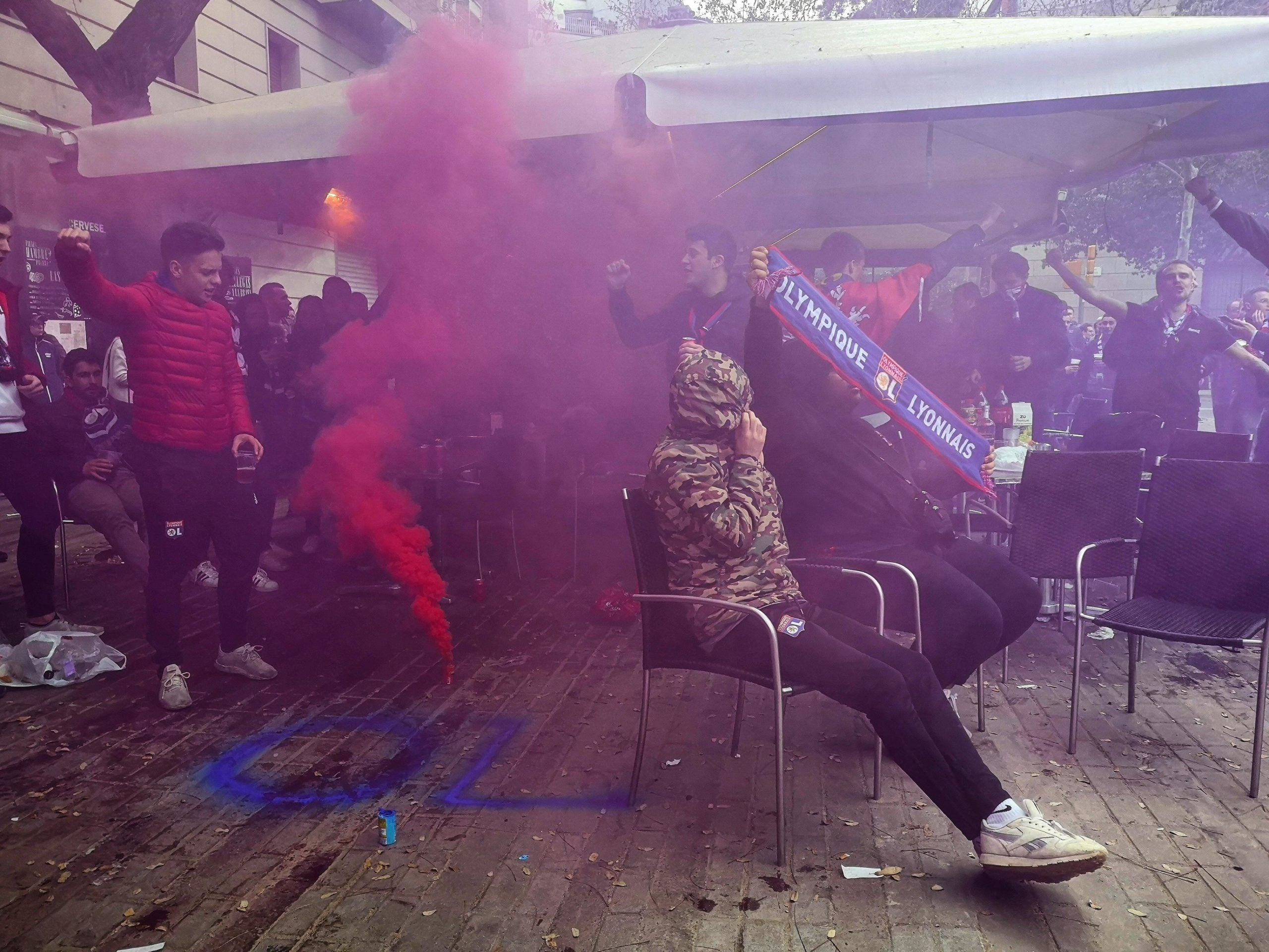 Un dels veïns del bloc que dona a la plaça ha llançat cubells d’aigua als aficionats i els seguidors del Lió han respost amb llançaments d’ampolles de vidre contra el seu balcó. Por després els aficionats han trencat la porta de vidre de l’edifici i han utilitzat l’entrada com a urinari improvisat. Davant el reiterat llançament de bengales, els Mossos han identificat diversos seguidors del club francès i els han requisat les bengales que portaven a sobre.