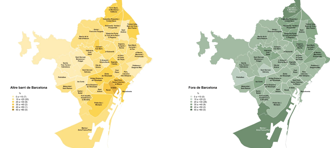En tot cas, encara hi ha una majoria que preferiria quedar-se a la ciutat. Una majoria, concretament, del 72%. Ara bé, també és remarcable que, malgrat continuar a Barcelona, gairebé dos de cada deu persones (el 17%) optaria per canviar de barri. És el que passa sobretot a la zona més turística: entre el 40 i el 50% dels veïns del barri del Gòtic marxarien del barri si tinguessin la possibilitat, segons la darrera enquesta municipal. I entre el 30 i el 40% dels veïns que viuen al Raval i Sant Pere, Santa Caterina i la Ribera –barris fronterers amb el Gòtic– marxarien de la zona.