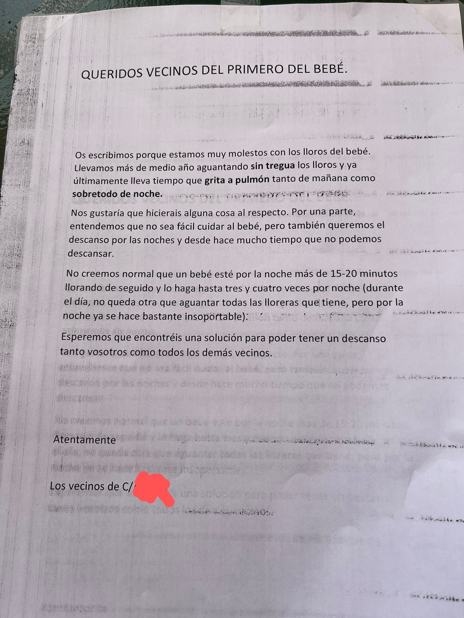 La nota comença amb un, presumiblement cínic, “Estimats veïns del primer del bebè”, el to no seria igual de cordial durant les línies posteriors. Aquests veïns es queixen que “Fa més de mig any que aguantem sense treva els plors i últimament crida a ple pulmó tant de dia com sobretot de nit”, una frase que ha estat precedida per un”Estem molt molests“.