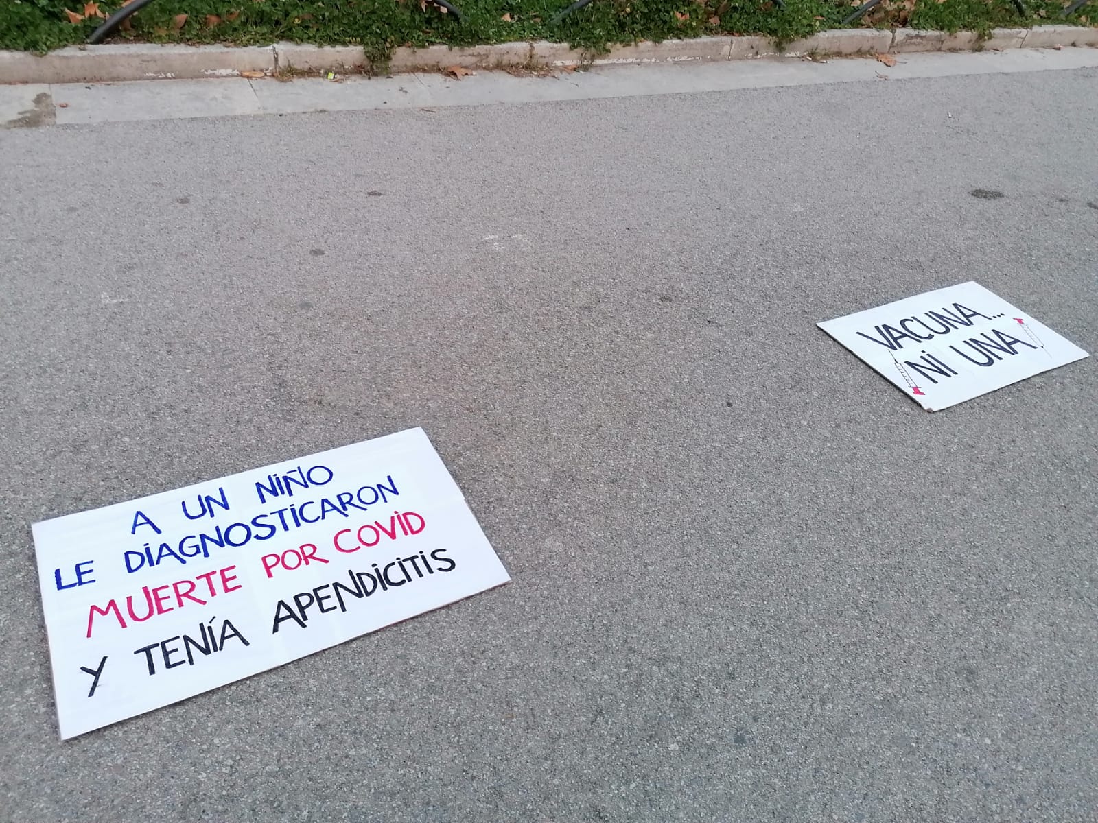 Alguns dels missatges que deien les pancartes cridaven a manifestar-se: “A què esperes per sortir al carrer?”. D’altres animaven a abraçar-se: “Vols una abraçada? Digues-m’ho”. O instaven a desconfiar dels mitjans de comunicació: “Apaga la TV, està plena del virus de la por”. “No diem que no hi hagi una malaltia”, es defensava un home. “Però què és?!”, es preguntava, desesperada, una dona. “A un nen li van diagnosticar mort per Covid i tenia apendicitis”, afirmava, demolidora, una pancarta.