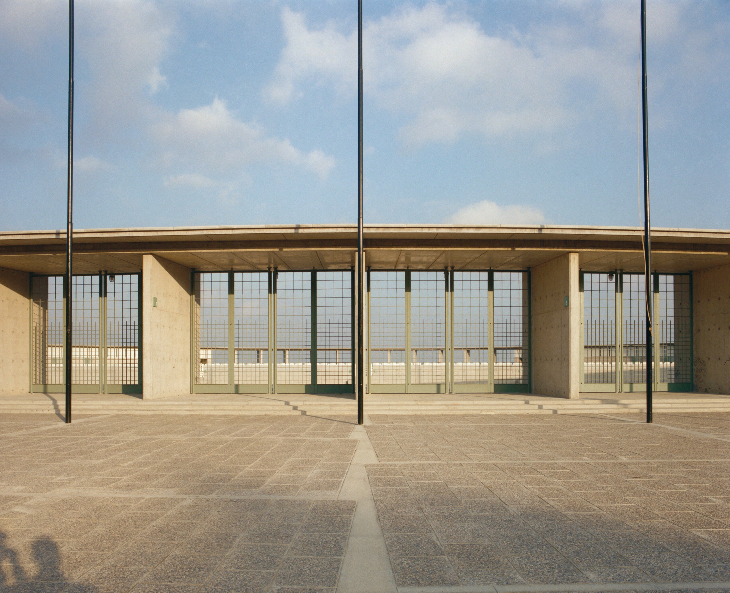 També té una funció pràctica: els seus 4 metres de gruix amaguen tots els serveis per als espectadors i deixen encara una reserva d’espai per a una possible ampliació de les grades o per col·locar-hi càmeres de televisió. I entre les grades i l’entrada hi ha quatre torres obliqües que serveixen per il·luminar l’espai.